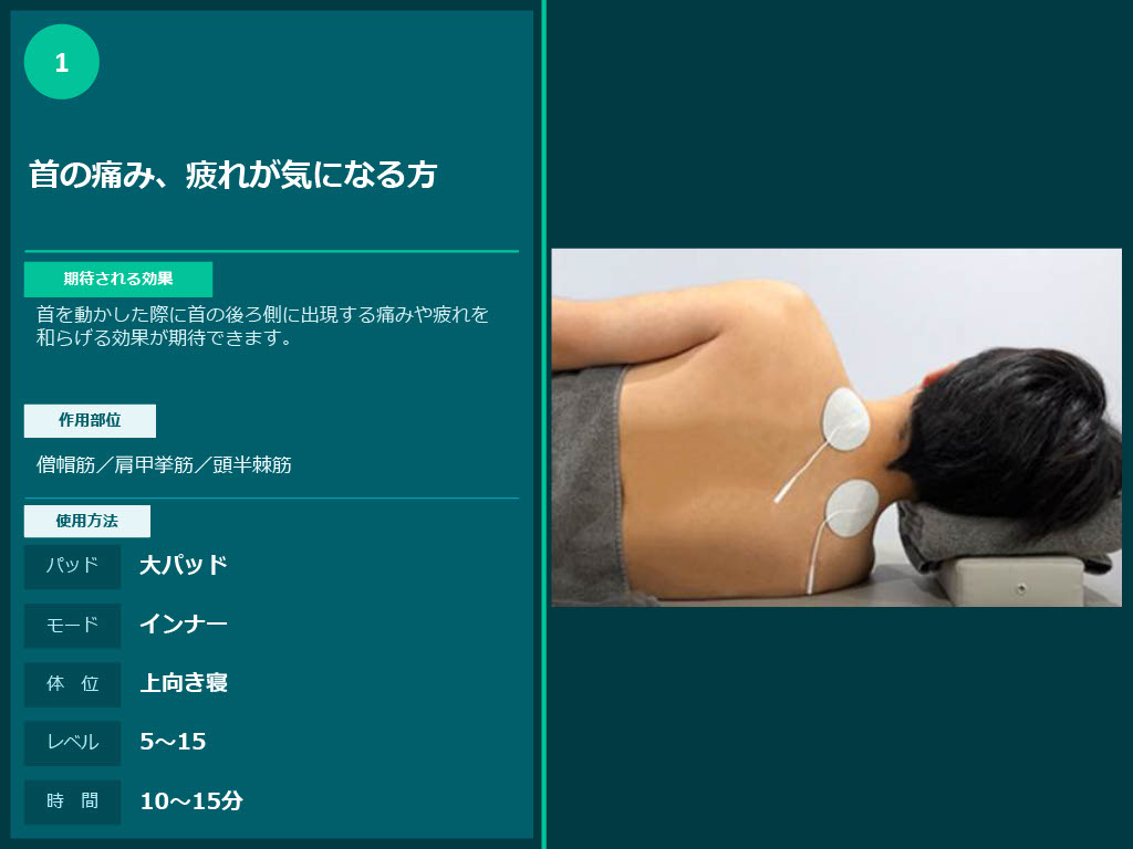 皆さんの悩みを解決するために、理学療法士監修のもと、分かりやすい症状別の貼り方を掲載しています。EXFIT-PROは、ただパッドを貼るだけではありません。的確な位置に貼ることで、あなたの不調にピンポイントでアプローチし、より効果を実感いただけます。