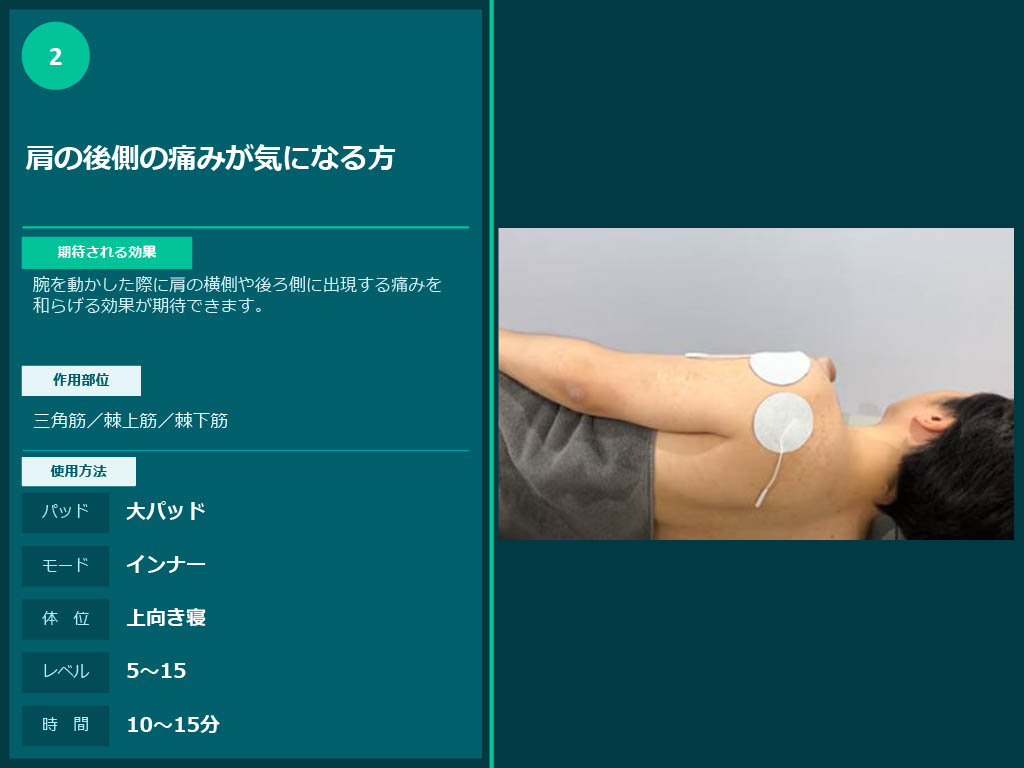 動作や目的に合わせてパッドの貼り方など解説付きの貼り方マニュアルが商品に同梱されておりますのでご参考にしてください。貼り方マニュアルからおすすめの貼り方を参考にご利用ください。